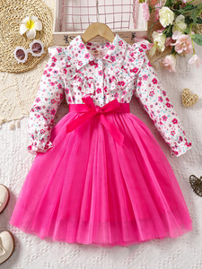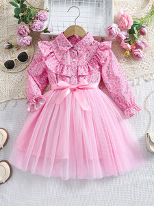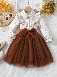 国境を越えた貿易女の子の春と秋の小花柄長袖シャツドレスボタンダウンシャツスプライシングメッシュスカート