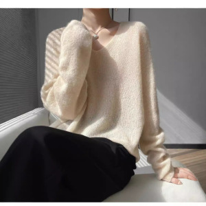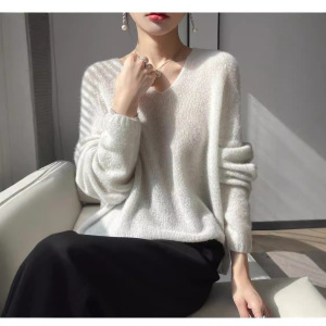 轻柔软糯~77%山羊绒23%桑蚕丝V领宽松针织衫—成衣无缝慵懒毛衣