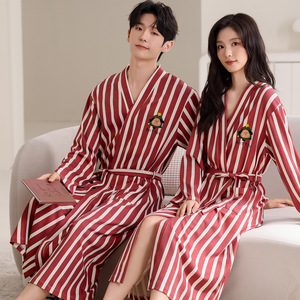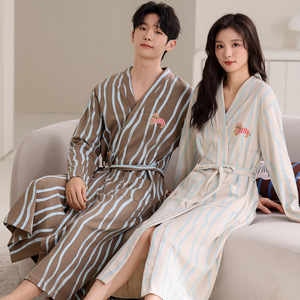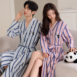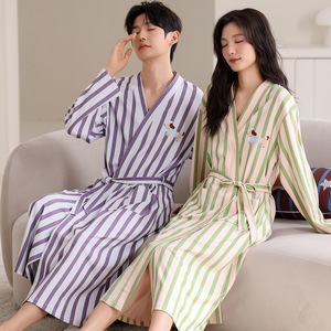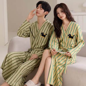 春と秋のカップル用パジャマ、カーディガン型ナイトガウン、純綿、男女兼用バスローブ、紐付きホームウェア、綿100%ローブ、カジュアルスタイル