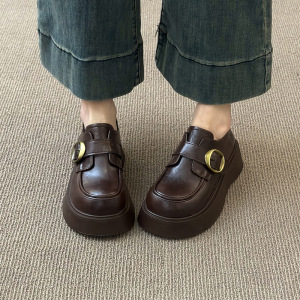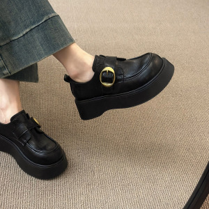 英国風の女性用小さな革靴 2025 春の新作プラットフォーム厚底ラウンドトゥ多用途ベルクロブラックローファー