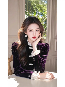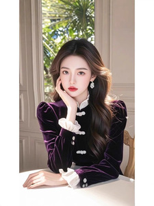 新中式国风气质紫色立领丝绒上衣女款2025秋季高级感立领打底上衣