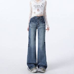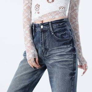 批发高光蓝美式复古低腰微喇直筒牛仔裤女宽松显瘦拖地阔腿裤