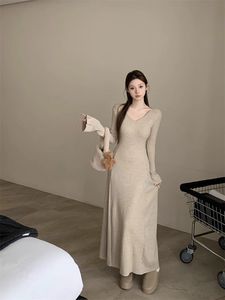 フランス式の黒いニットのワンピースの女装のギャルの秋冬の新型vネックの気質はお尻を包んで底の長いスカートの女性を打ちます。
