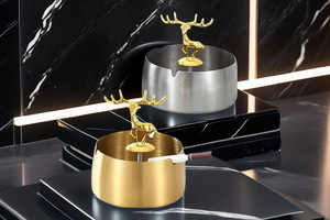 ゴールデンステンレス鋼灰皿、鹿の角付き、軽い高級感、パーソナライズされた創造的なトレンド、家庭用リビングルームの装飾品、灰の卸売