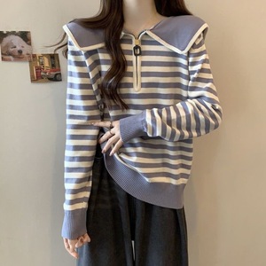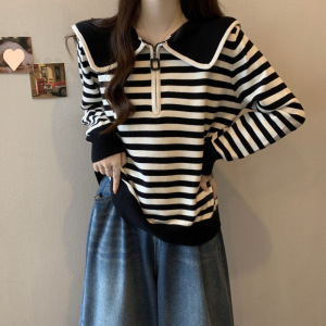 法式海军领条纹针织衫长袖女秋冬大码胖宽松遮肚子别致拉链上衣