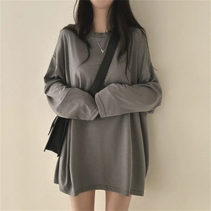 クロスボーダー卸売綿 100% グレー韓国スタイルボトリングシャツ Tシャツ女性の秋のお尻カバー大きいサイズ長袖トップインナー