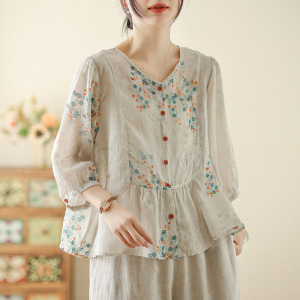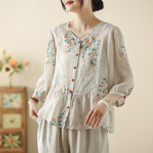 夏のランダムプリント綿麻レース丸首シャツ女性レトロ文芸気質シャツゆるい花色シャツ