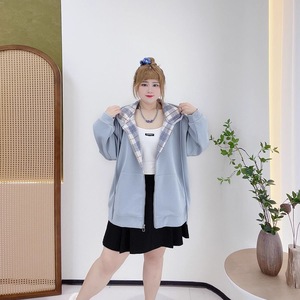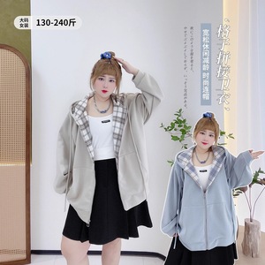 80-300大码女装胖mm春秋韩版休闲风宽松百搭撞色格纹拉链卫衣外套