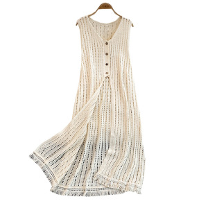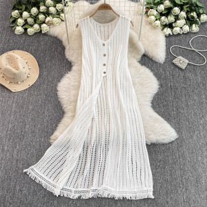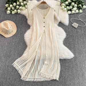 白色设计感小众蕾丝流苏针织连衣裙女夏季开叉镂空叠穿罩衫裙长裙