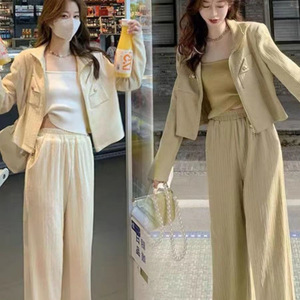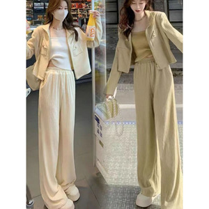春秋新款洋气时尚阔腿裤三件套休闲运动气质小香风套装