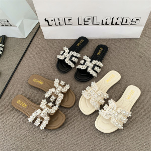 フレンチパールスリッパ女性の夏のアウターウェア 2025 新しい妖精の香りのファッションフラットビーチサンダル