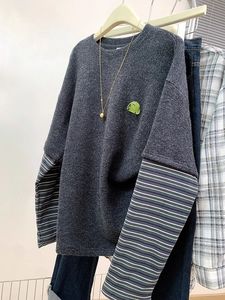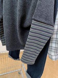 特大サイズ 120kg フェイクツーピースストライプスプライシング長袖 Tシャツ女性のための春レトロ起毛ボトムシャツトップイン