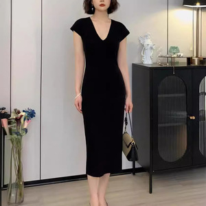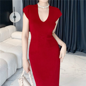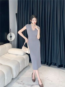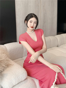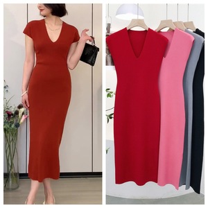 7607 夏用14針ハイツイストコットンVネック袖付き右肩カバー胸ウエスト痩身ニットワンピースヒップカバースカート