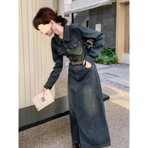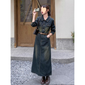2025新款时尚休闲复古色中长款牛仔连衣裙女春秋款收腰显瘦长裙子