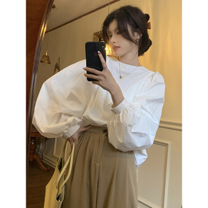 フレンチランタンパフスリーブ白シャツレディースニッチデザインルーズラウンドネックハイエンドシャツカジュアル韓国トップ