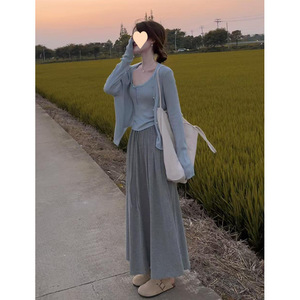 秋冬减龄穿搭一整套温柔风蕾丝吊带背心针织开衫加厚半身裙三件套