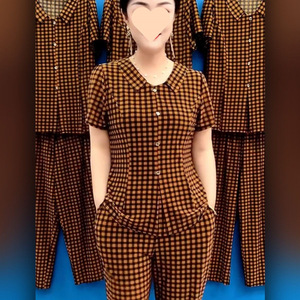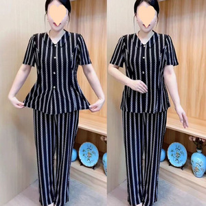 2025夏季新款短袖套装妈妈宽松休闲条纹上衣时尚洋气大码两件套