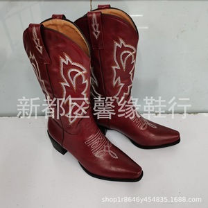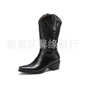 WISHクロスボーダー外国貿易秋冬新作先端刺繍糸中太ヒールレディース大きいサイズスリーブ中筒西部ブーツX418