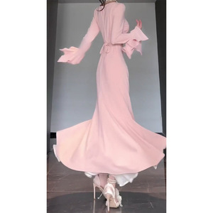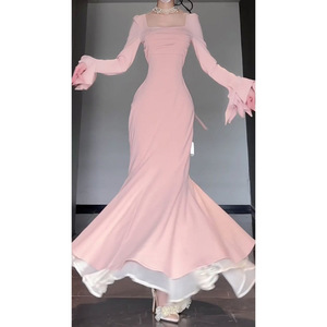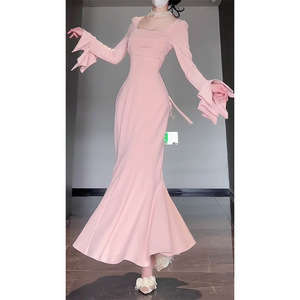 秋冬の女性のためのフレンチジェントルスタイルのピンクドレス、甘いスリムウエストスクエアネックフレアスリーブフィッシュテールスカート