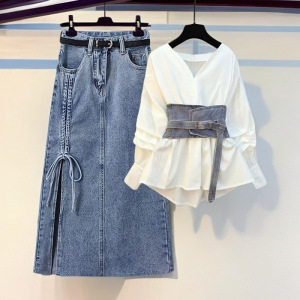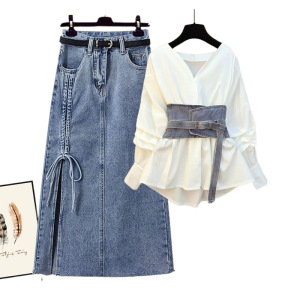 春季套装女2025新款大码女装设计感小众收腰衬衫牛仔半身裙两件套