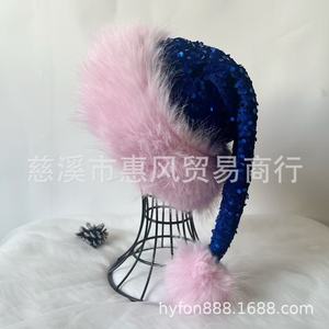 クロスボーダー新製品クリスマス帽子サファイアブルーフルスパンコール二層ぬいぐるみ装飾帽子 31*47 センチメートルスリムピンクエッジ雰囲気帽子