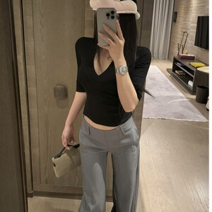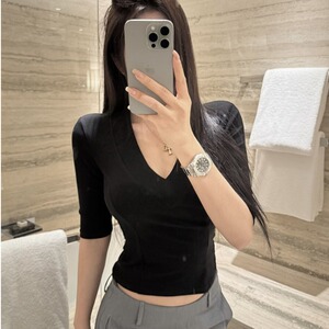 MR【随心裁】夏季新款深v领正肩气质半袖辣妹纯欲风修身打底衫女t