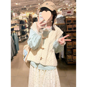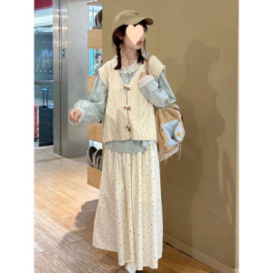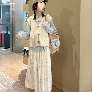 甜美小清新长袖衬衫针织马甲背心女秋季小个子穿搭显瘦半身裙套装