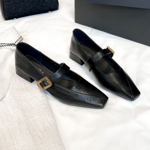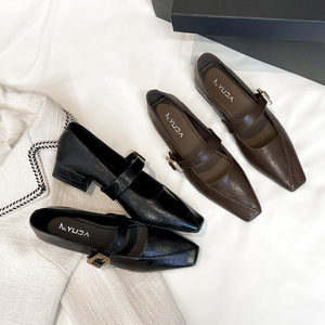 フレンチスタイルスクエアトゥ浅口靴2025春秋韓国版新作イブニングスタイルレトロ小さな革靴太いヒール靴