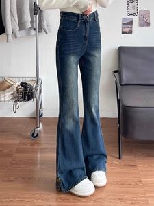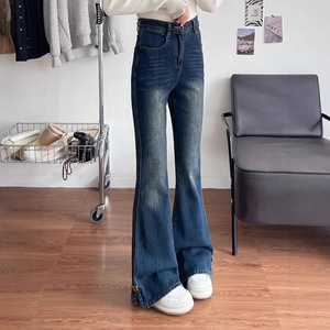 レトロなオープンフォークの微ラッパジーパンの女性と春秋の大きいサイズの太ったmmの春の新型の高い腰の弾力性はやせているスピーカーのズボンを現します。