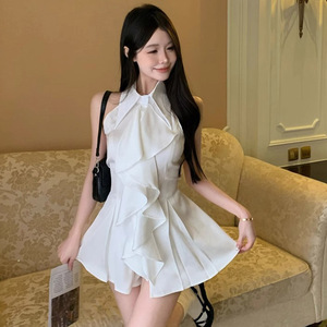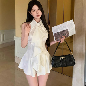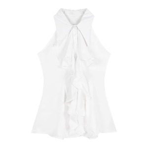 公式写真 実価 フリルノースリーブシャツ トップス レディース 夏 フレンチスタイル ミドル丈 ウエストスリムシャツ