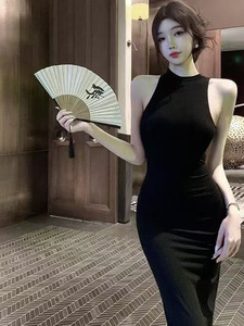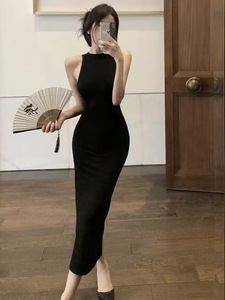 Yujiefan 無地スリットロングノースリーブラウンドネックドレス伸縮性タイトフィットボディシェイプヒップホップホットガールリトルブラックドレス