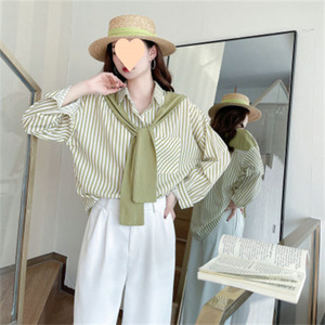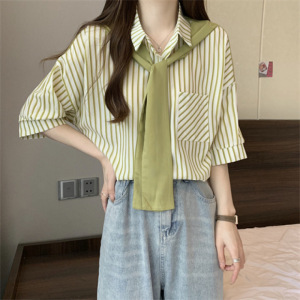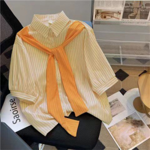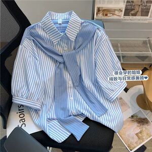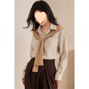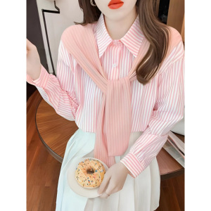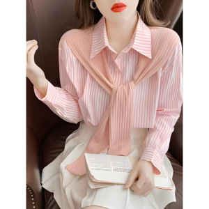 女士披肩假两件上衣女小个子衬衣2025年新款春季长袖条纹雪纺衬衫