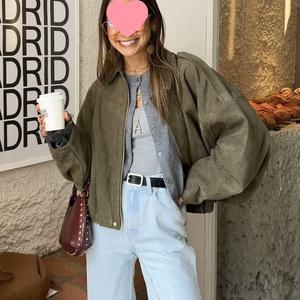 春と秋のラペルクロスボーダークロスボーダーカラー女性カジュアルヨーロッパとアメリカンスタイルのスエードボンバージャケットコートの質感
