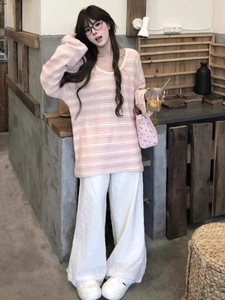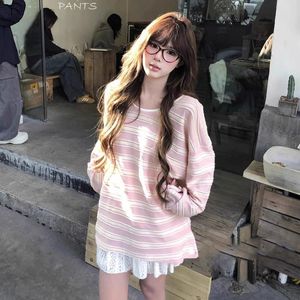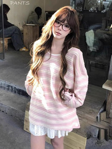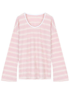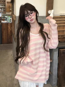 跨境撞色条纹长袖T恤女春夏百搭新款宽松慵懒风别致上衣ins潮批发