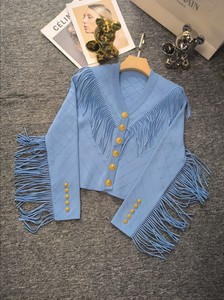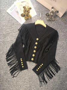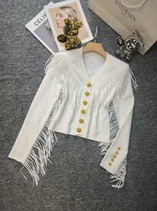 2025 新しいスタイルのレディースメタルバックルトップデザインタッセル菱形 V ネック弾性スリムニットカーディガン