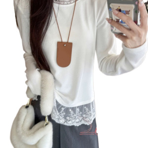 法式纯欲蕾丝拼接圆领德绒打底衫女秋冬新款内搭长袖恤时尚上衣