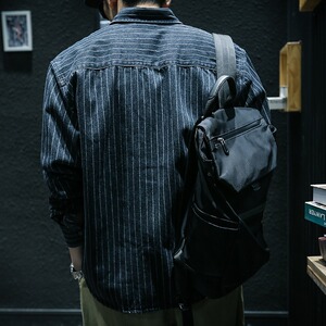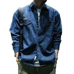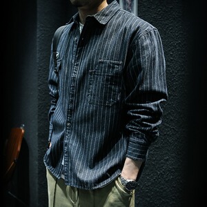 アメリカンヘビーウェイトストライプデニムシャツメンズ長袖2025新作ルーズワークシャツメンズ春秋ジャケットメンズ