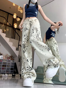ヨーロッパとアメリカンスタイルの女性用ワイドレッグパンツ、ニッチなデザイン、白のヒョウ柄ジーンズ、ルーズ、ハイウエスト、カジュアル、多用途、ストレートレッグ、フロアレングス