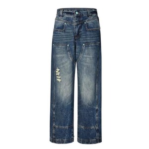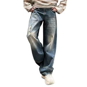 跨境美式复古做旧脏洗擦色阔腿牛仔裤潮牌宽松老爹裤水洗直筒长裤