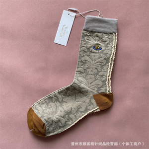 日本の土星刺繍女王母花エンボス加工レディースソックスハイチューブニッチトレンディソックスレトロカラーコットンソックスキャットウォークトレンディソックス