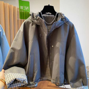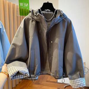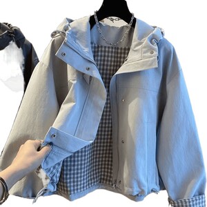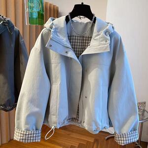 2025新款宽松格子内衬蓝色连帽风衣外套女春秋短款超
