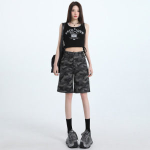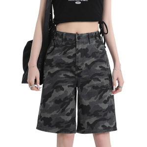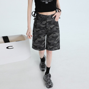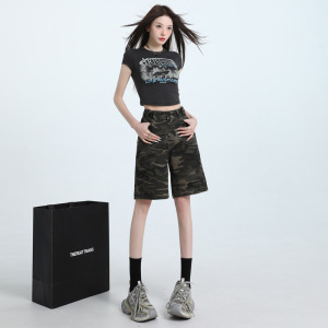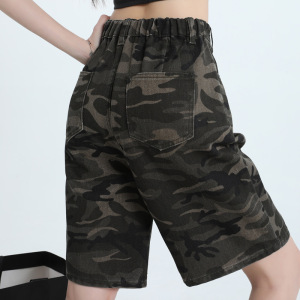 2025春夏新作迷彩柄パンツセクシー風五分丈デニムショートパンツゴムウエストデニムパンツレディース着痩せ効果