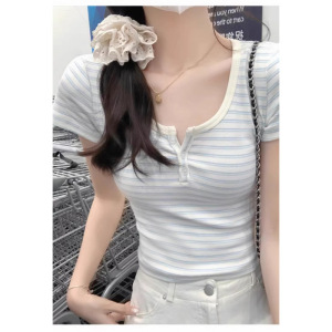 青と白のストライプの右肩Tシャツレディース半袖春夏新デザインハーフオープンカラースリムフィットインナーショートトップ