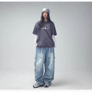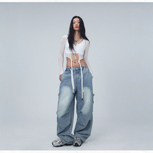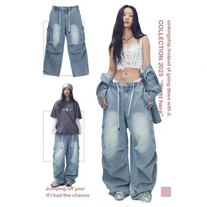 【ピンチプリーツデザイン】既製ヒップホップトレンドブランドライトブルージャズウォッシュデニムレトロストリートパンツ膝ピンチプリーツ