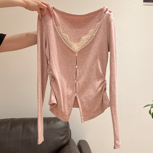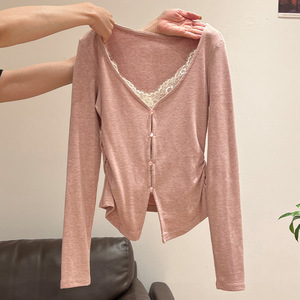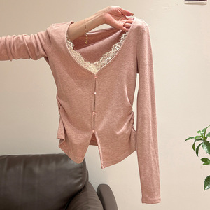 春秋韩系洋气上衣法式甜美拼接蕾丝打底衫女假两件V领新款纯欲风