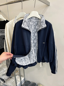 ネイビーブルーのスポーツ野球ユニフォーム女性のための 2025 春と秋の新しいヨーロッパのファッションレースジャケットトップ服