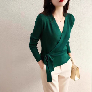 不规则早秋新款交叉毛衣针织衫女洋气韩版显瘦百搭打底衫V领上衣