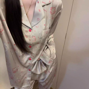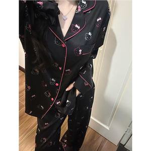 2025春夏韓国版シンプルなホットダイヤモンドKitty猫氷糸パジャマ女性長袖ズボンセット春秋家庭服