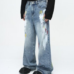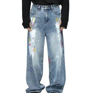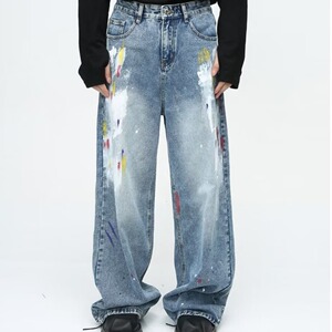 クロスボーダートレンドグラフィティスプラッシュインクジーンズ男性と女性のための韓国スタイルストレートレッグルーズニッチデザインワイドレッグロングパンツ