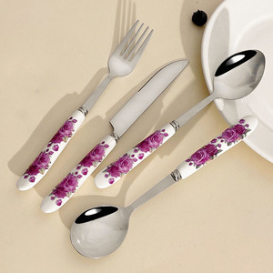 国境を越えた売れ筋セラミックハンドルナイフ、フォーク、スプーン、ステンレス鋼洋食食器セット、ハンドル付きナイフとフォーク、レトロな尖ったスプーン、ラウンドスプーン